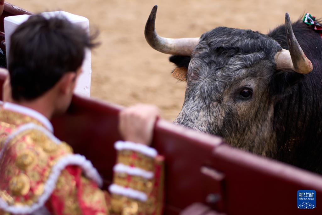 9月7日,一名斗牛士在西班牙馬德里拉斯本塔斯斗牛場內的斗牛表演中與公牛對視。