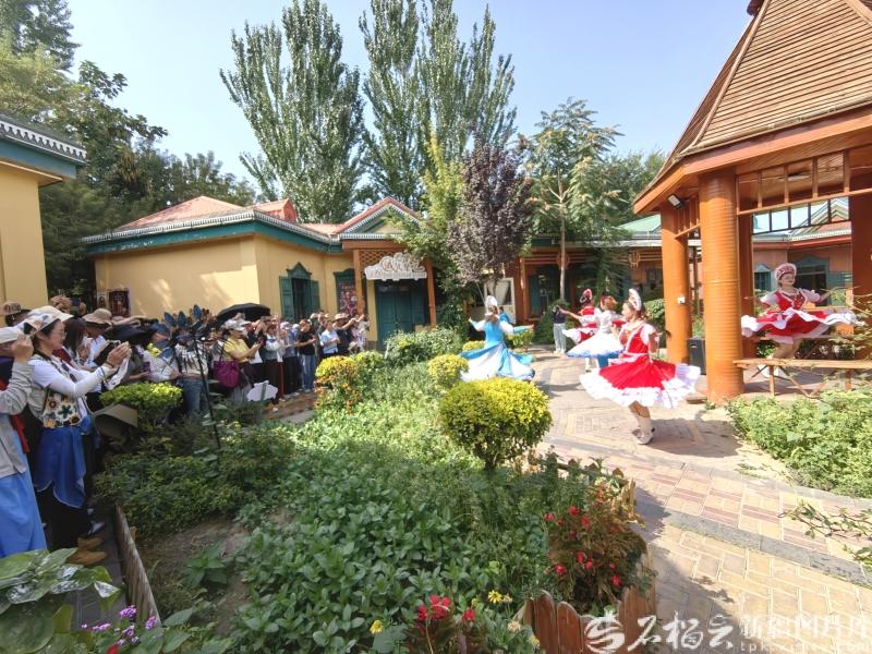 9月8日,在伊寧市六星街景區(qū),演藝人員跳起了熱情的迎客舞。