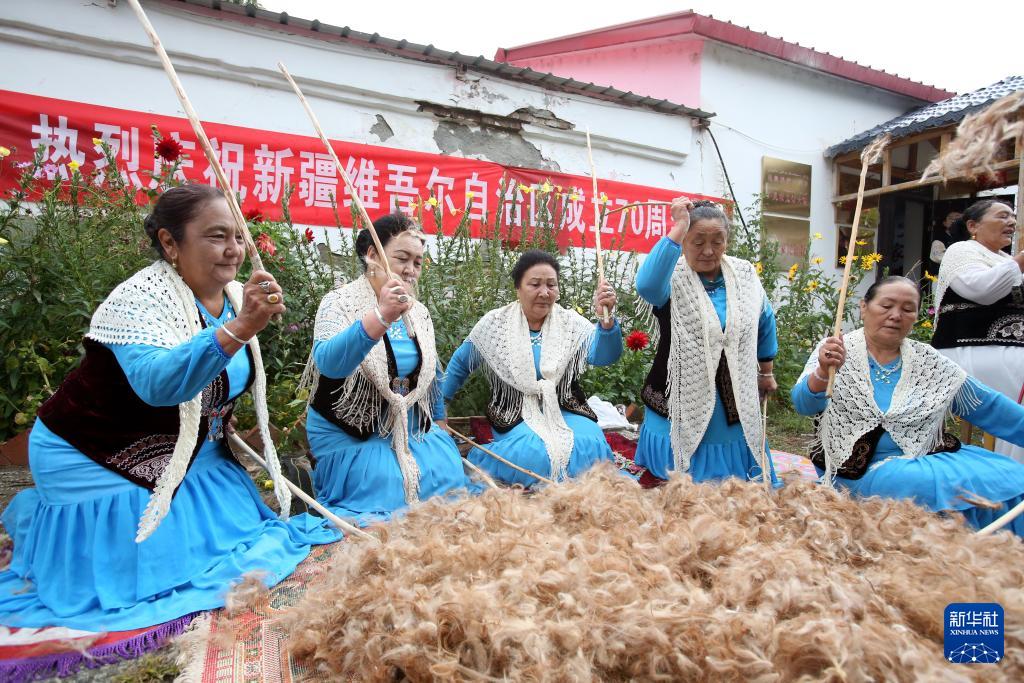 9月9日,老人在“戶兒家”文化大院打羊毛。