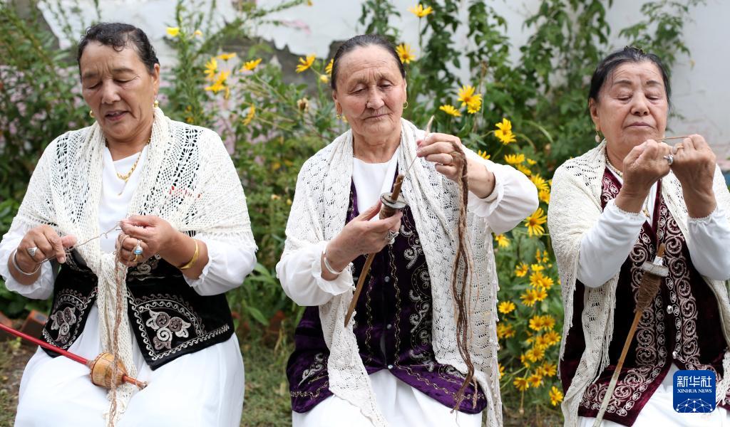 9月9日,75歲的哈薩克族老人馬合什·沃合什在“戶兒家”文化大院捻羊毛。