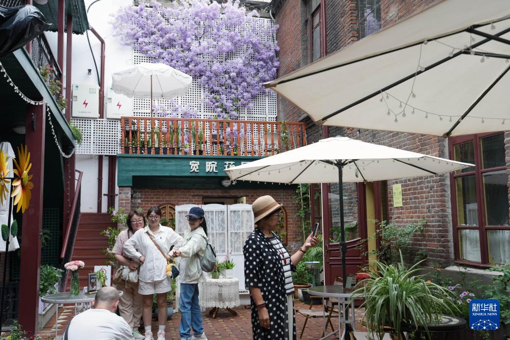 人們在位于哈爾濱市西十三道街的寬街博物館后院拍照(9月3日攝)。