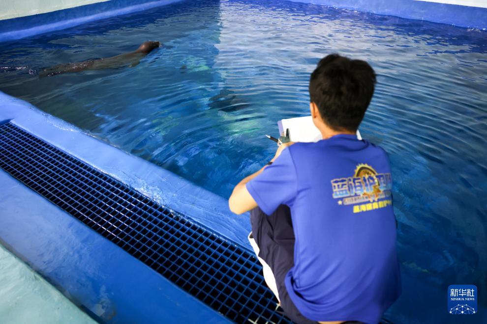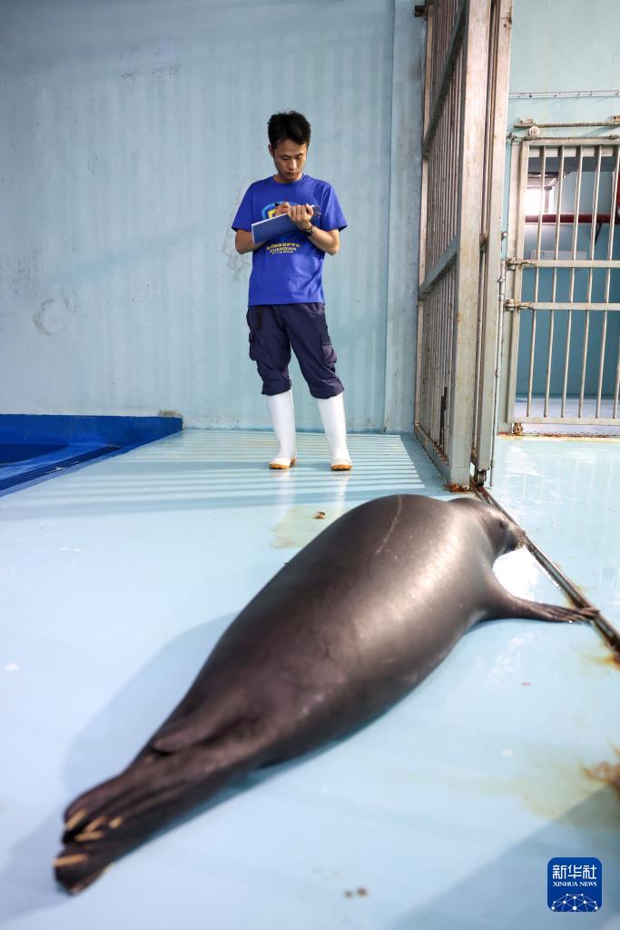 9月8日,在海南陵水藍海保育救護中心,救助人員在觀察記錄海豹“阿儂”的行為。