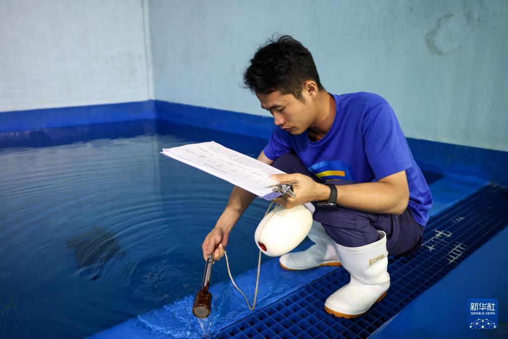 9月8日,在海南陵水藍海保育救護中心,救助人員在測試水溫。