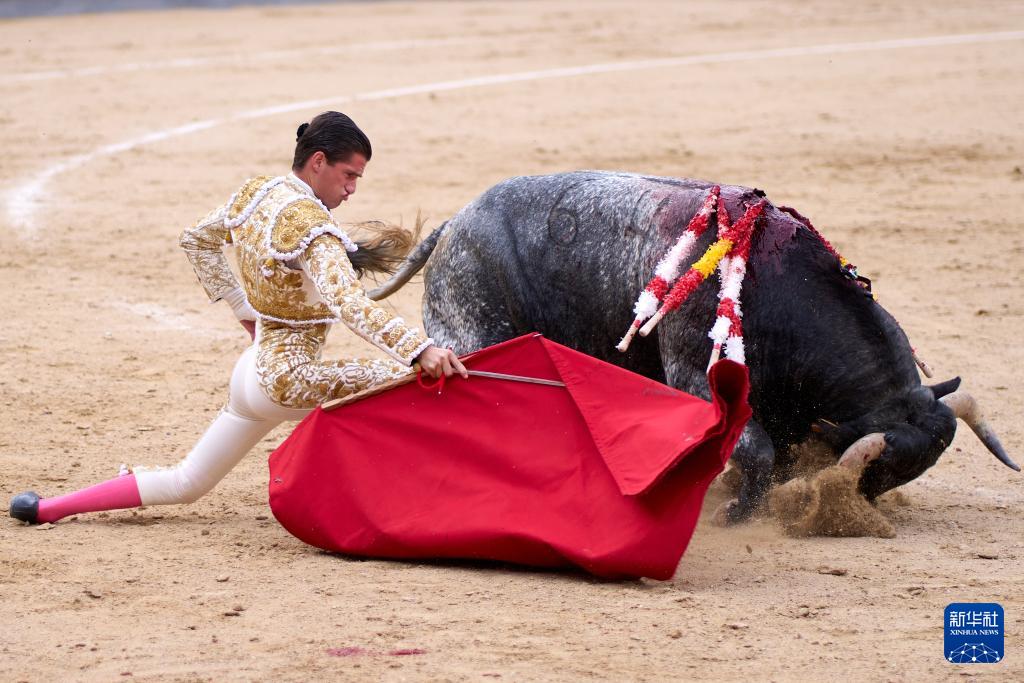 9月7日,一名斗牛士在西班牙馬德里拉斯本塔斯斗牛場內進行斗牛表演。