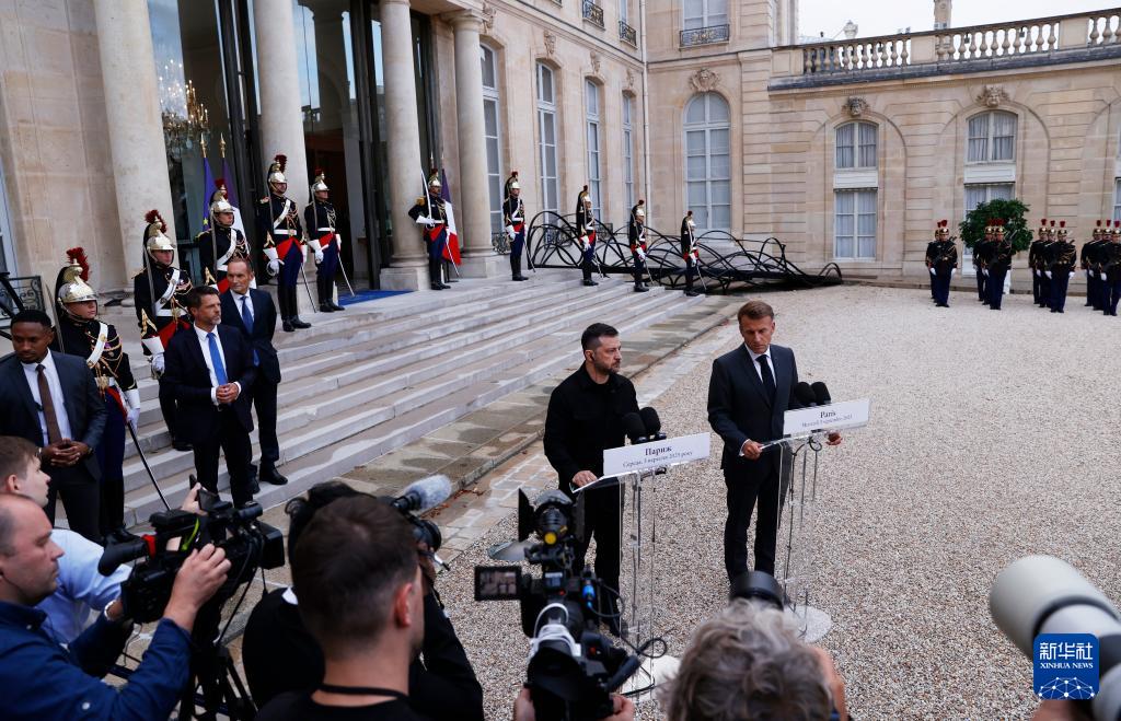 9月4日,在法國首都巴黎的總統府愛麗舍宮,法國總統馬克龍(右)迎接出席“志愿聯盟”線上會議的烏克蘭總統澤連斯基。