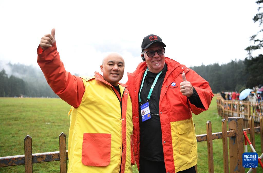 9月8日,與會代表(右)在麗江玉龍雪山景區的云杉坪留影。