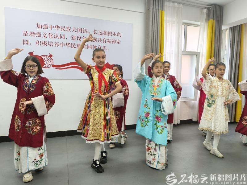 12歲的娜扎開提·帕爾哈提江(左二)放學后和小伙伴們在社區"小小少年宮"練習京劇唱腔。石榴云/新疆日報記者 冉虎攝