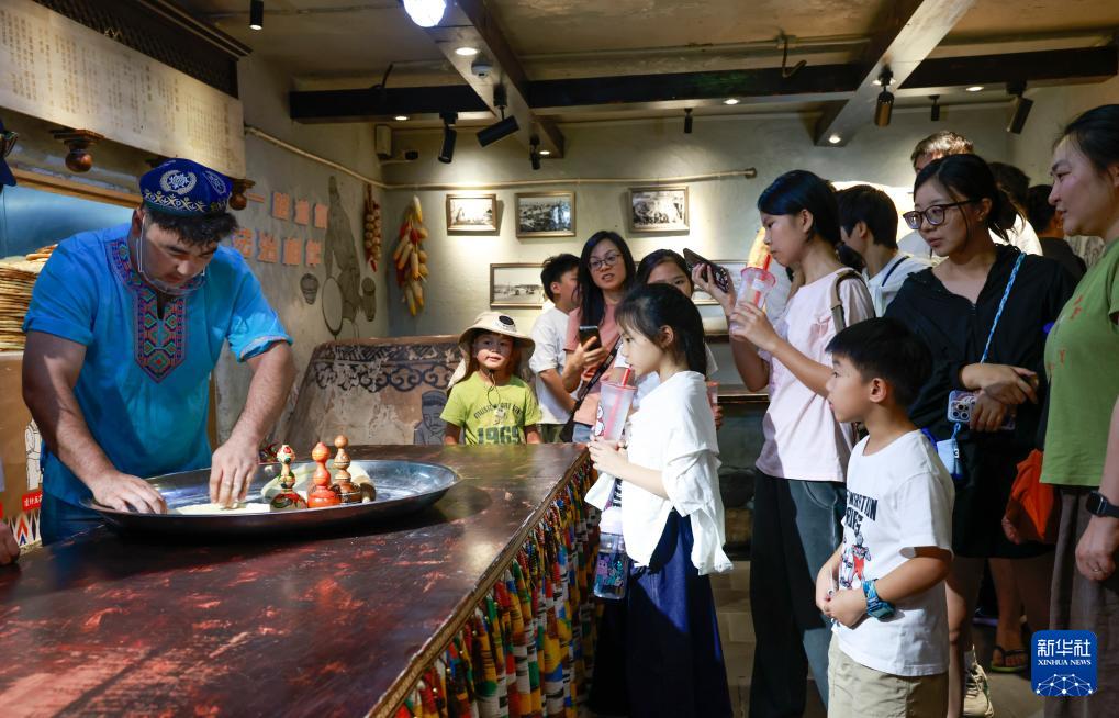 7月23日,在位于烏魯木齊的大巴扎馕主題館,工作人員為游客展示打馕技巧。