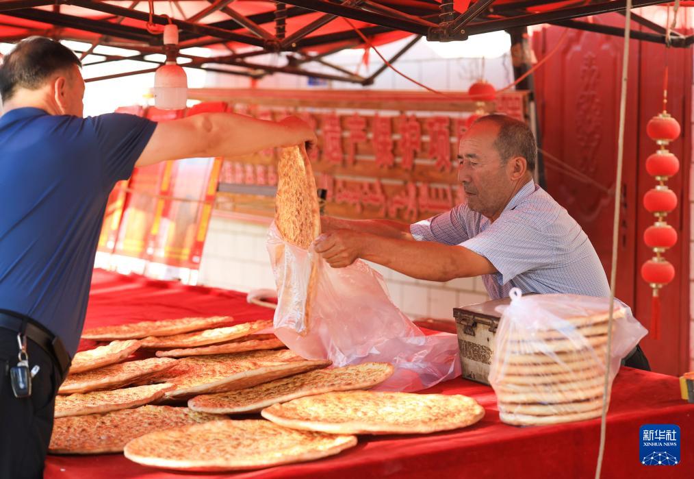 7月22日,在新疆庫車市,居民從熱西提馕店買馕后離開。