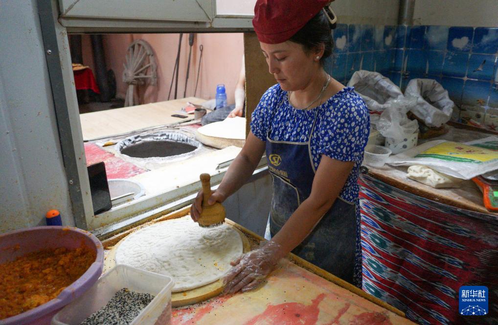 7月22日,在新疆庫車市,熱西提往馕坯上撒放香料。