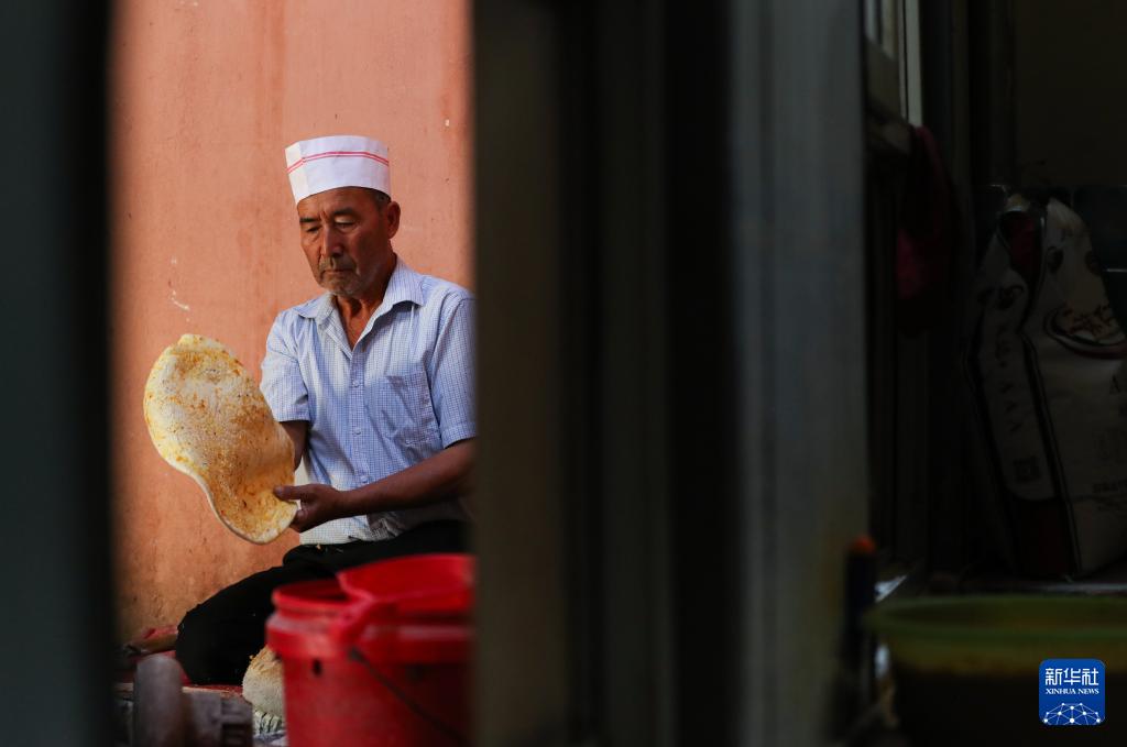 7月21日,在新疆庫車市,熱西提在自家馕店中制作馕坯。
