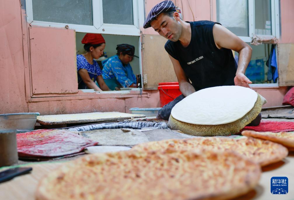 7月22日,在新疆庫車市,熱西提的兒子阿里木江·熱西提在自家馕店中打馕。