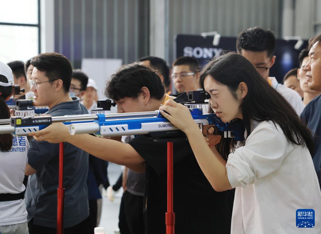 9月11日,參觀者在體育服務(wù)專題展區(qū)體驗(yàn)激光射擊。