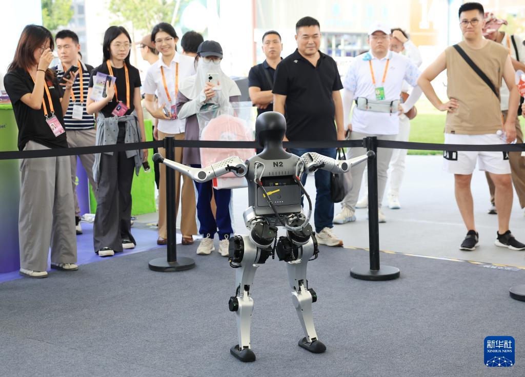 9月11日,參觀者在體育服務專題展區觀看人形機器人做廣播體操。