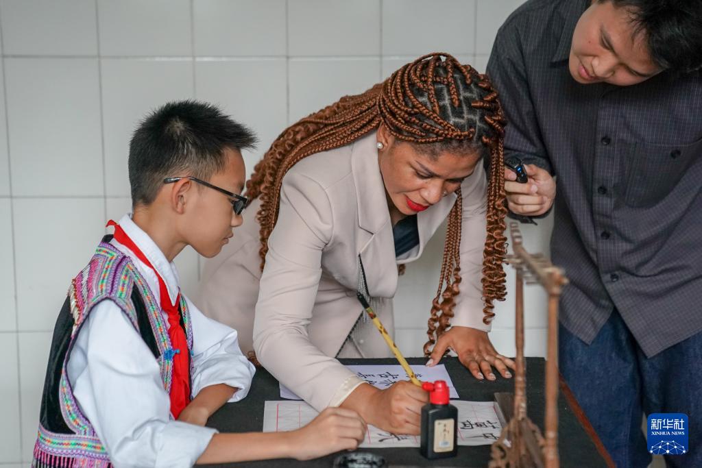 9月9日,米拉格羅薩·米查在中國-赤道幾內亞友誼小學同孩子們交流書法。