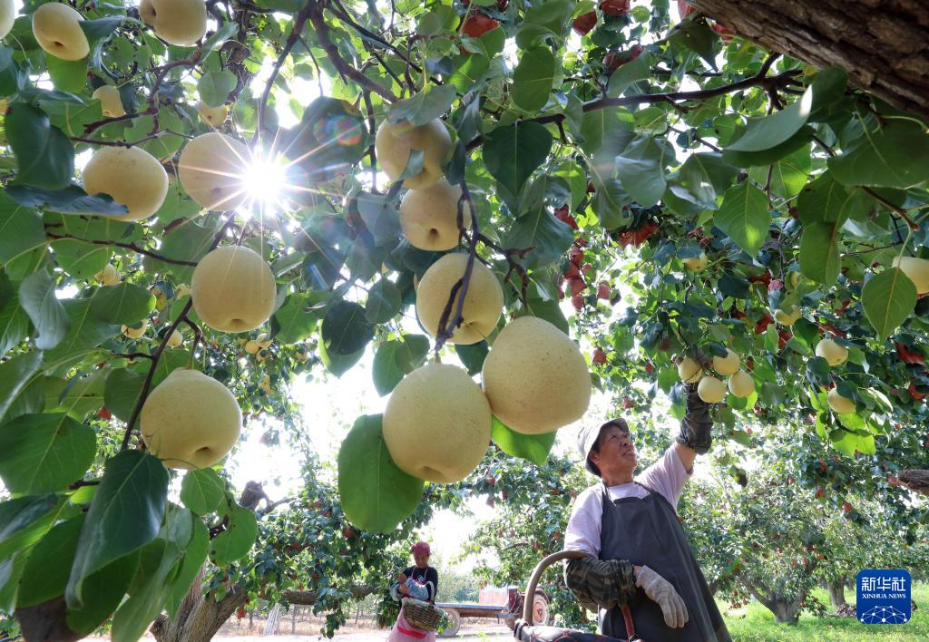 9月11日,河北省晉州市周家莊鄉第七生產隊農民在梨園采收鴨梨。