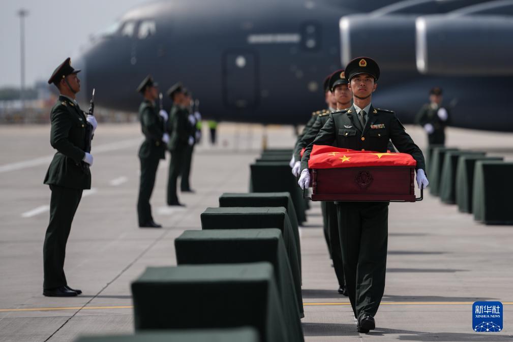 9月12日,第十二批在韓中國人民志愿軍烈士遺骸回國。這是在沈陽桃仙國際機場,禮兵將殮放志愿軍烈士遺骸的棺槨從專機護送至棺槨擺放區。