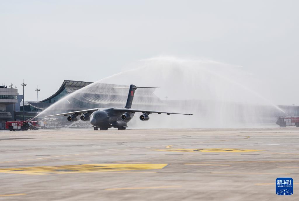 9月12日,第十二批在韓中國人民志愿軍烈士遺骸回國。這是在沈陽桃仙國際機場,接運烈士遺骸回國的運-20專機通過水門。