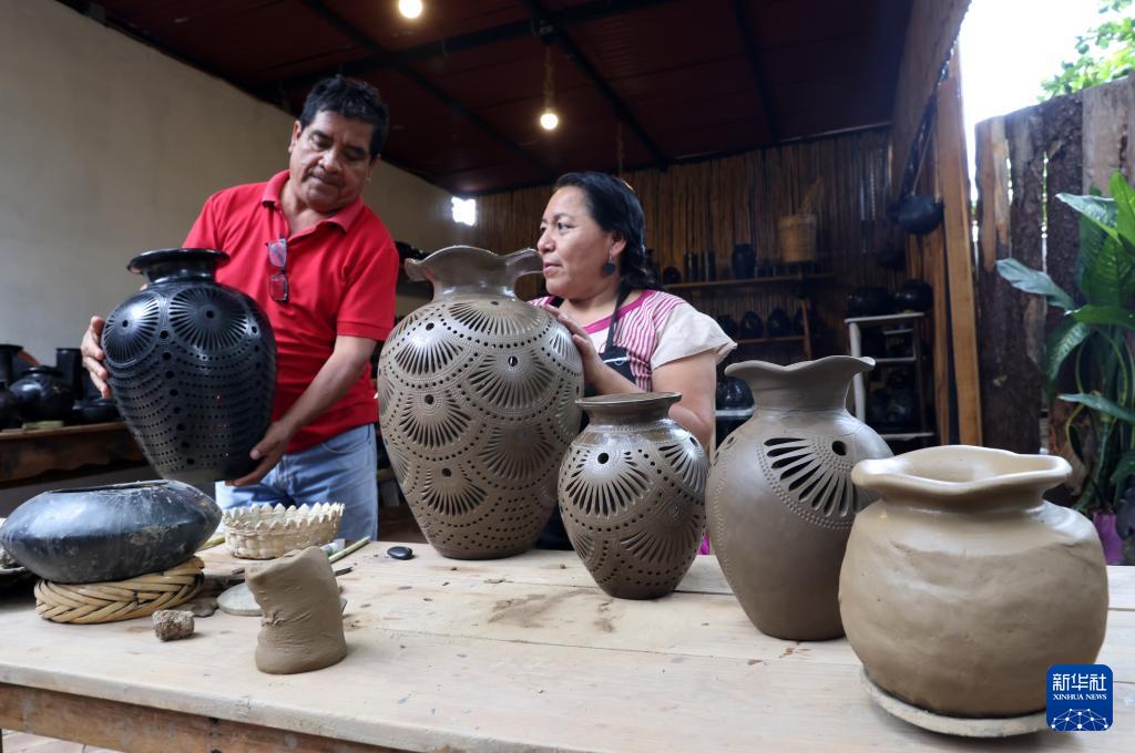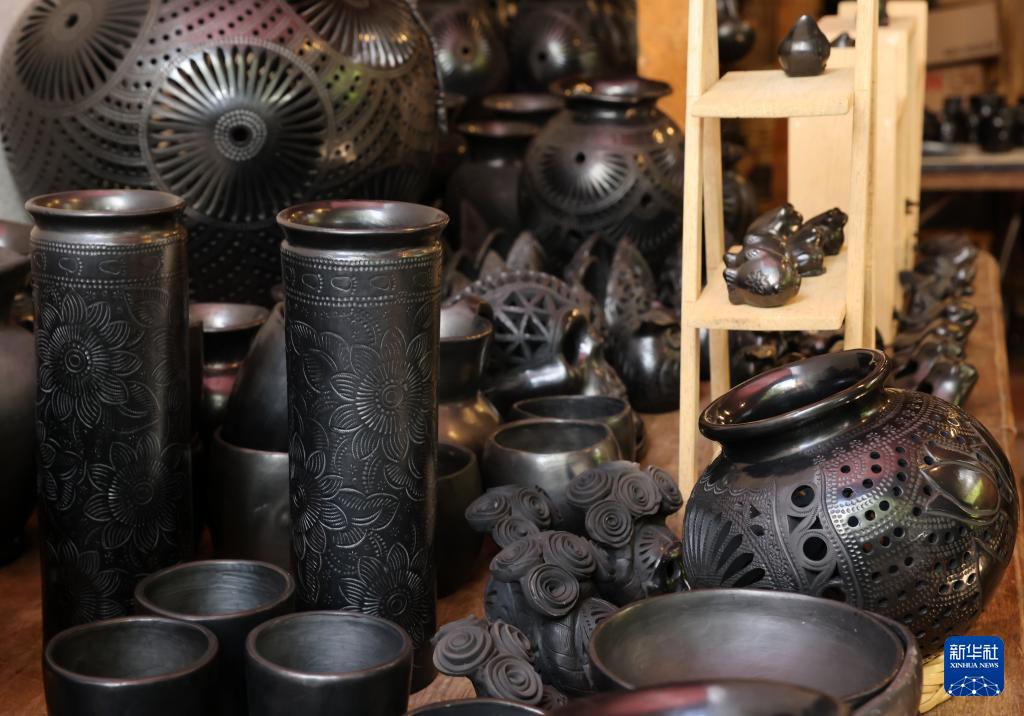 9月14日,在墨西哥瓦哈卡州的圣巴托洛科約特佩克市,黑陶手工藝者展示不同步驟下的黑陶制品。