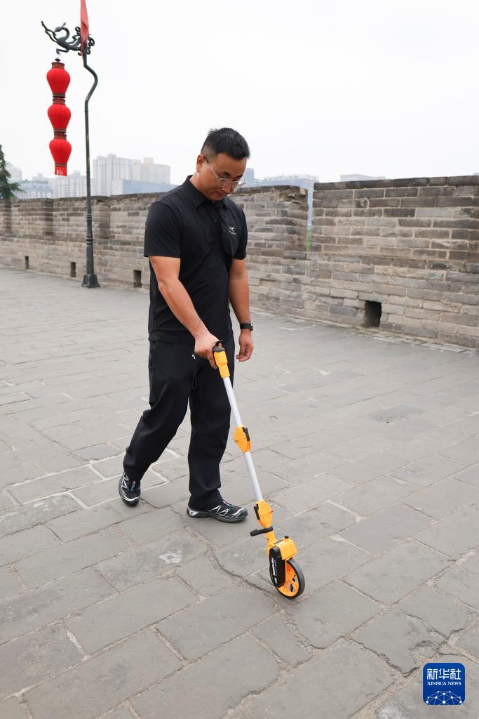 9月10日,一名文保巡查員在城墻上測量海墁裂縫長度。
