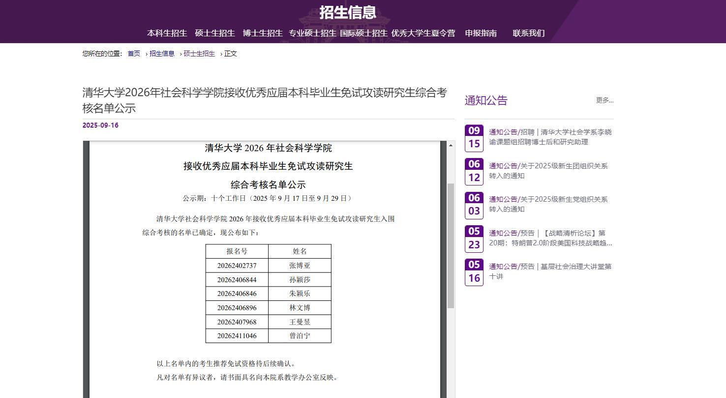 9月16日,清華大學(xué)2026年社會(huì)科學(xué)學(xué)院接收優(yōu)秀應(yīng)屆本科畢業(yè)生免試攻讀研究生綜合考核名單公示,孫穎莎、王曼昱榜上有名。