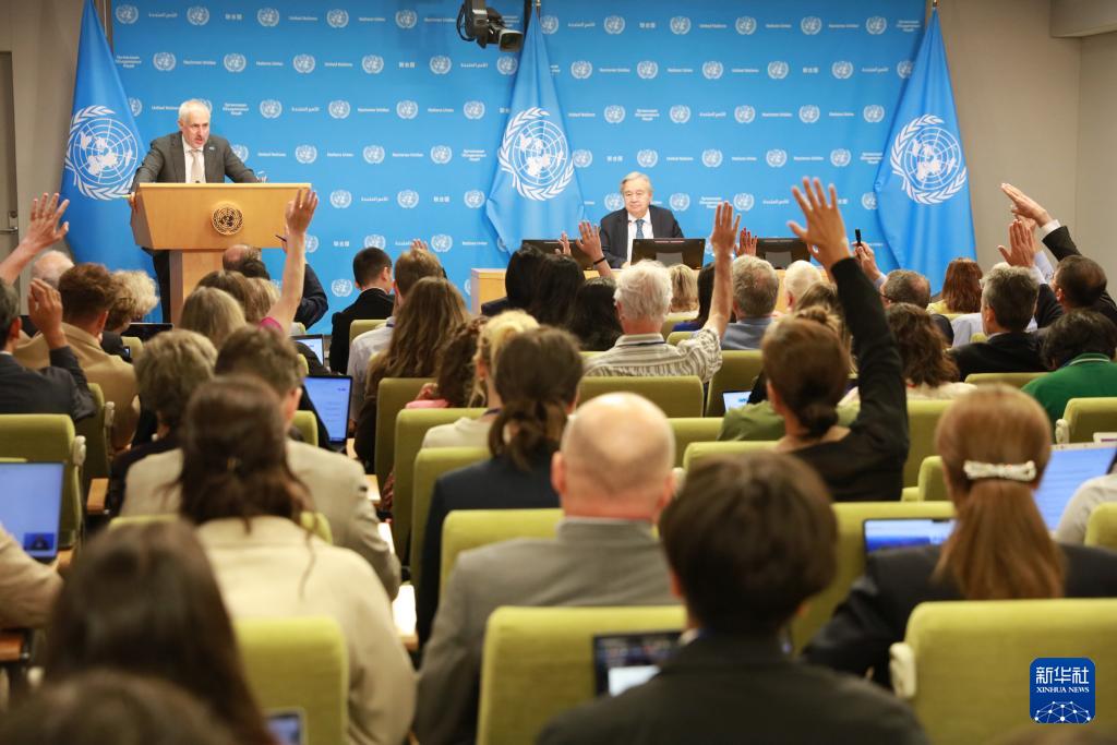 9月16日,在位于紐約的聯合國總部,聯合國秘書長古特雷斯(后右)在新聞發布會上講話。華社記者謝鍔攝