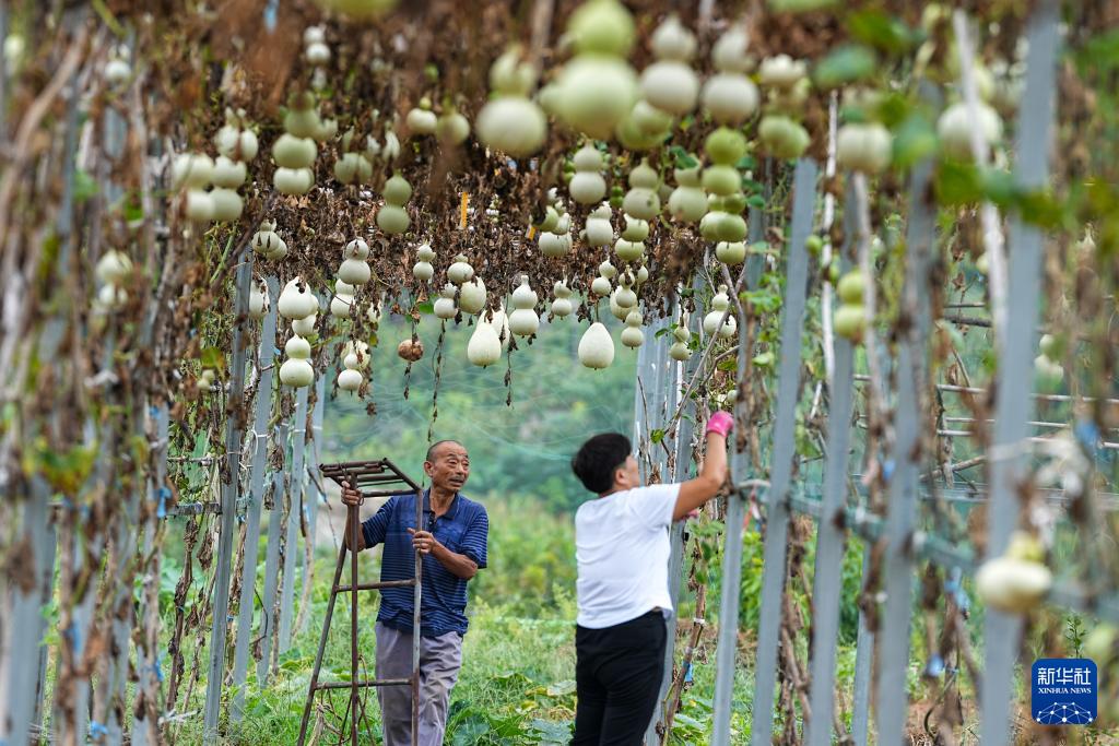 9月16日,村民在肥城市老城街道張家花峪村打理觀賞葫蘆。2022年,這個村創辦肥城市七姑娘頂生態農業專業合作社,引導村民栽植葫蘆3000余株,發展葫蘆種植特色產業。
