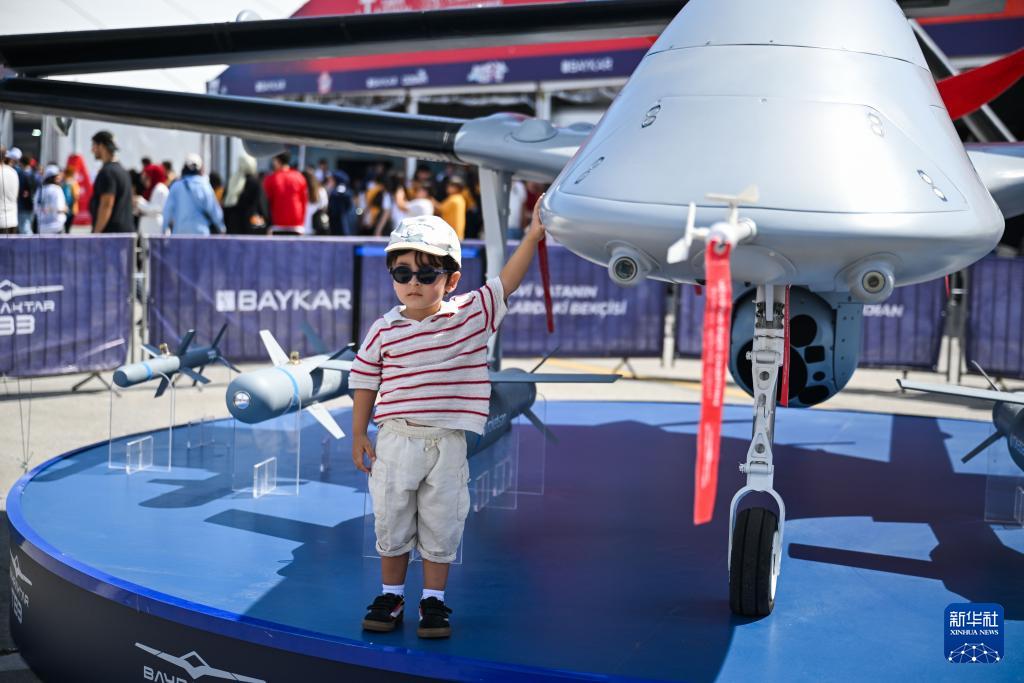 9月17日,一名兒童在土耳其伊斯坦布爾的科技展上與一架無人機展品合影。