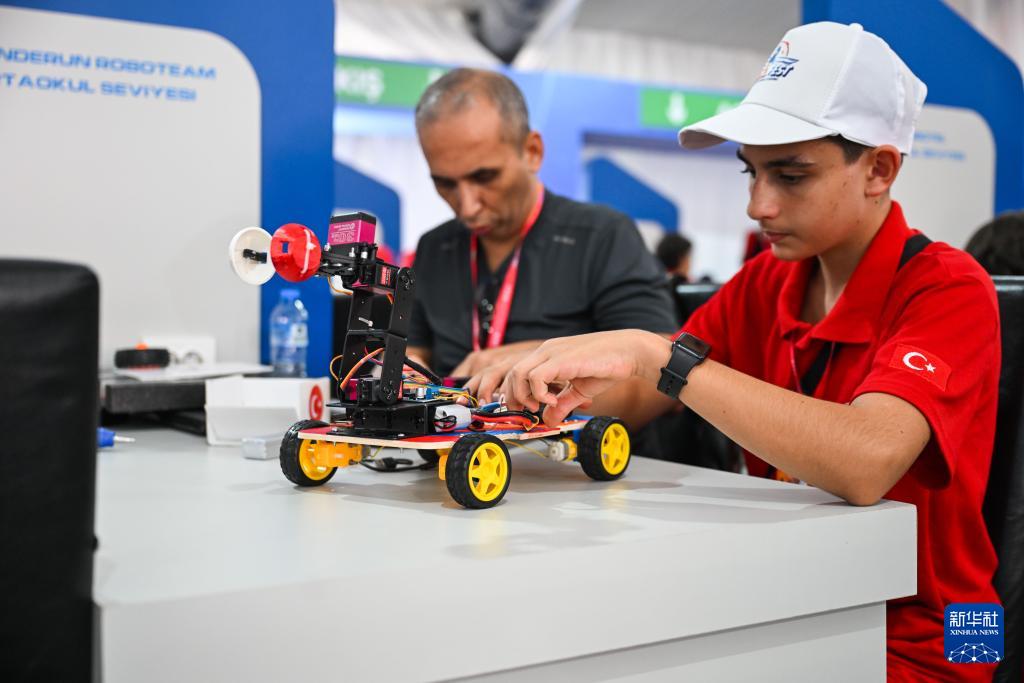9月17日,一名參賽選手在土耳其伊斯坦布爾的科技展上調試機器人。