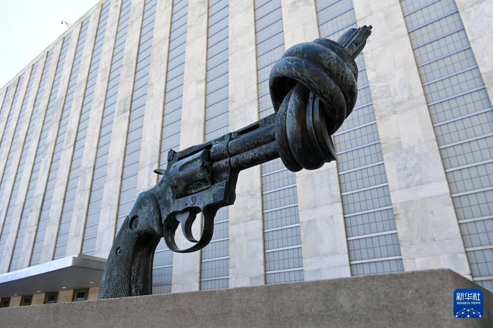 這是在位于紐約的聯合國總部拍攝的“打結的手槍”雕塑(9月18日攝)。