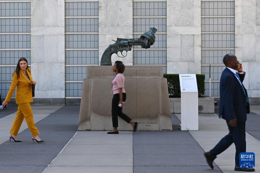 9月18日,在位于紐約的聯合國總部,人們從“打結的手槍”雕塑前走過。