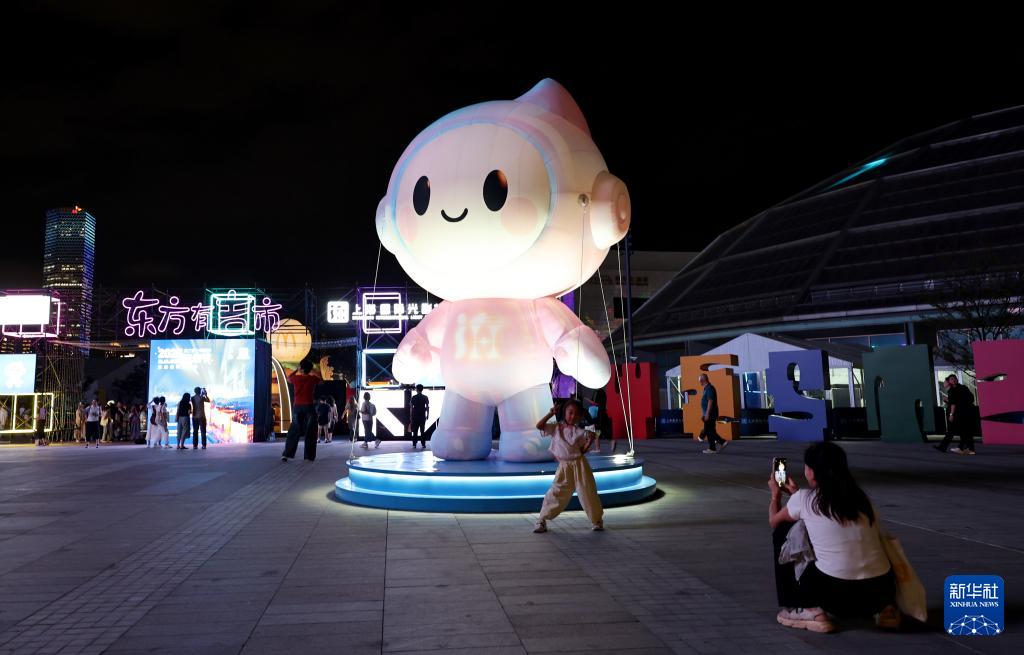 這是在徐匯濱江主會場集市外的第二屆上海國際光影節吉祥物“小靈光”造型燈光裝飾(9月19日攝)。