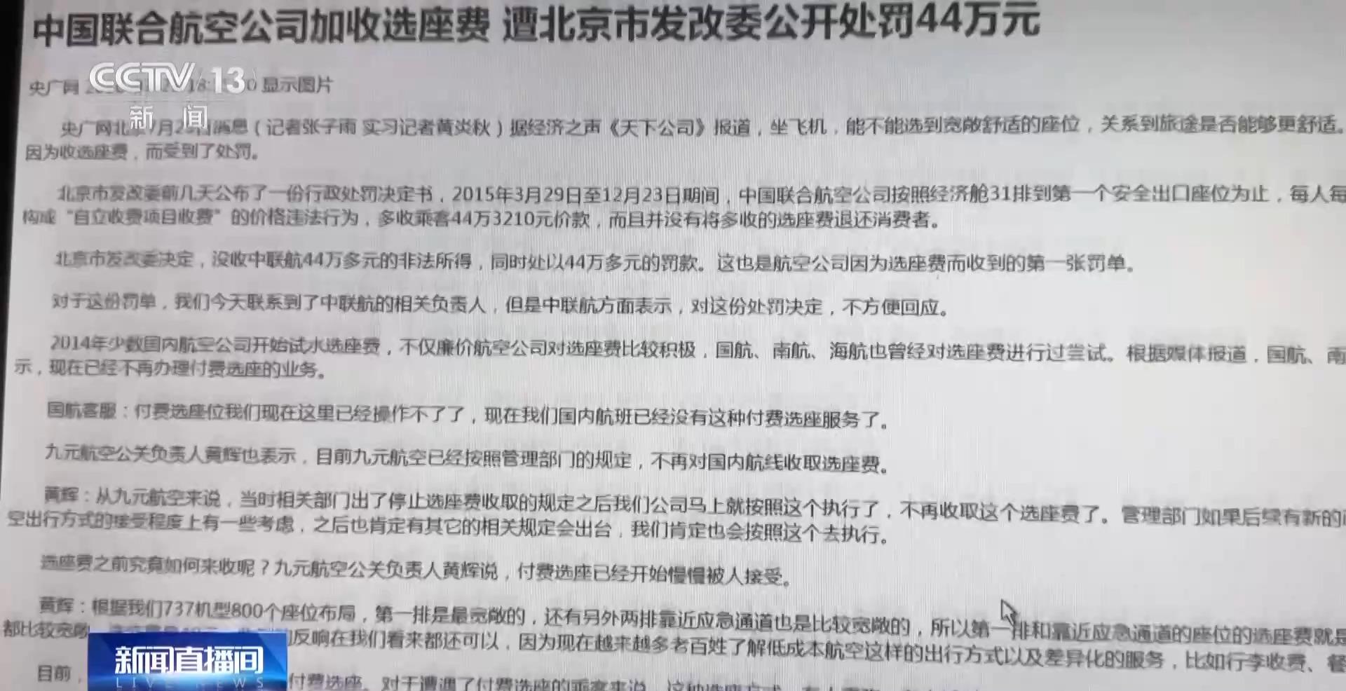 記者查詢相關資料發現,2016年北京市發改委曾對中國聯合航空公司的“選座收費”項目進行處罰,認定中國聯合航空公司“自立收費項目收費”,違反了價格法相關規定。但此后,各航空公司的有關“付費選座”業務,鮮有受到處罰。