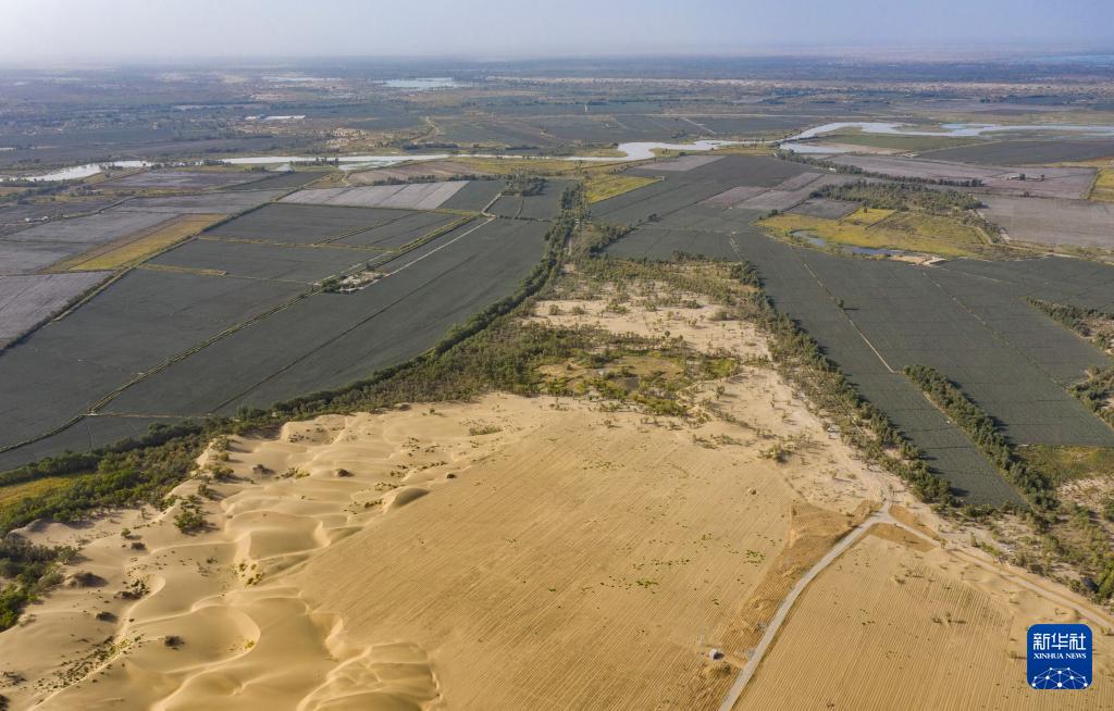在新疆尉犁縣境內的塔里木河南岸防沙治沙區拍攝的羅布麻種植區(右下)、治理之前自然形成的沙丘(左下)、塔里木河及周圍綠洲(上)(無人機照片,9月20日攝)。