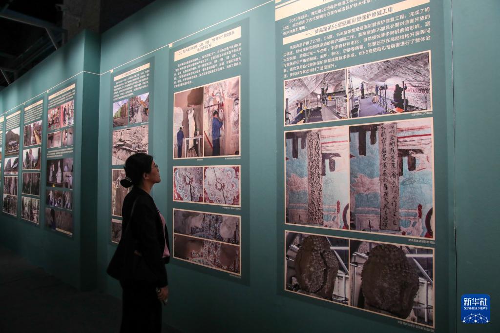 9月22日,在敦煌研究院“典范”“高地”建設成果展上,一名嘉賓在觀看莫高窟壁畫彩塑保護修復工程簡介。