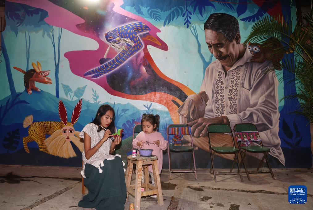 9月16日,在墨西哥瓦哈卡州圣安東尼奧阿拉索拉村一個彩色木雕工坊,一名手工藝人在雕塑上描畫花紋。