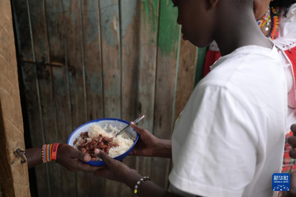 8月31日,在肯尼亞西南部納羅克郡西納羅克區艾通鎮的女童救助中心,一名女孩從廚房領取午飯。