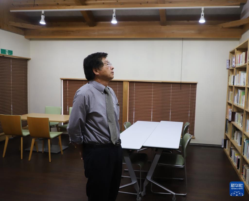 5月20日,在位于日本長野縣阿智村的“滿蒙開拓”和平紀念館,館長寺澤秀文查看館內書籍。