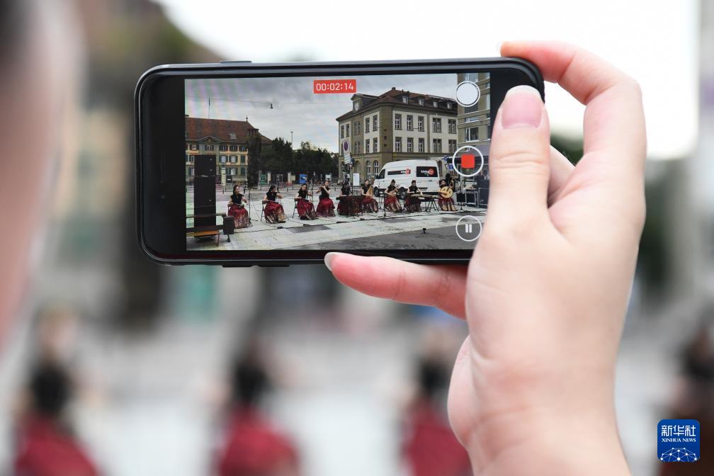 9月21日,在瑞士伯爾尼,一名觀眾在“你好!中國”文化和旅游推廣活動中拍攝中國民樂表演。