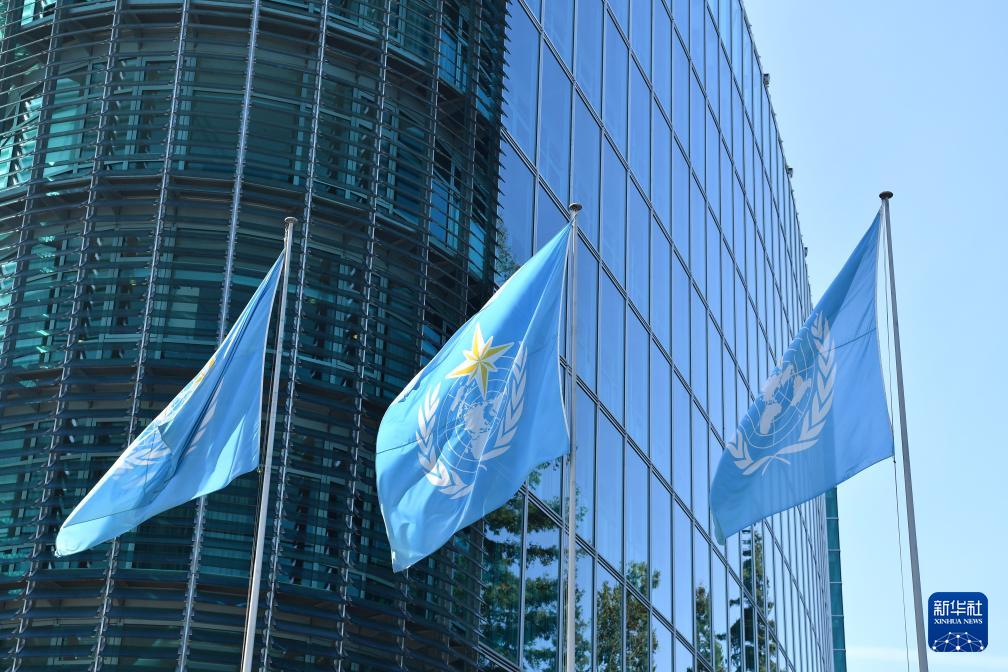這是9月17日在瑞士日內瓦世界氣象組織總部拍攝的世界氣象組織旗幟。
