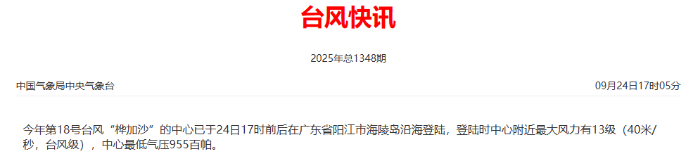 今年第18號臺風"樺加沙"的中心已于24日17時前后在廣東省陽江市海陵島沿海登陸,登陸時中心附近最大風力有13級(40米/秒,臺風級),中心最低氣壓955百帕。