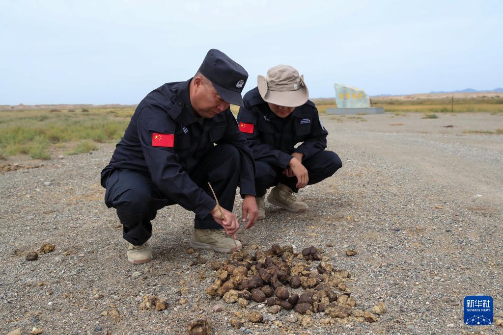 9月24日,甘肅敦煌西湖國家級自然保護區管護中心玉門關保護站站長吳興東(左)和工作人員在野外查看普氏野馬糞便。