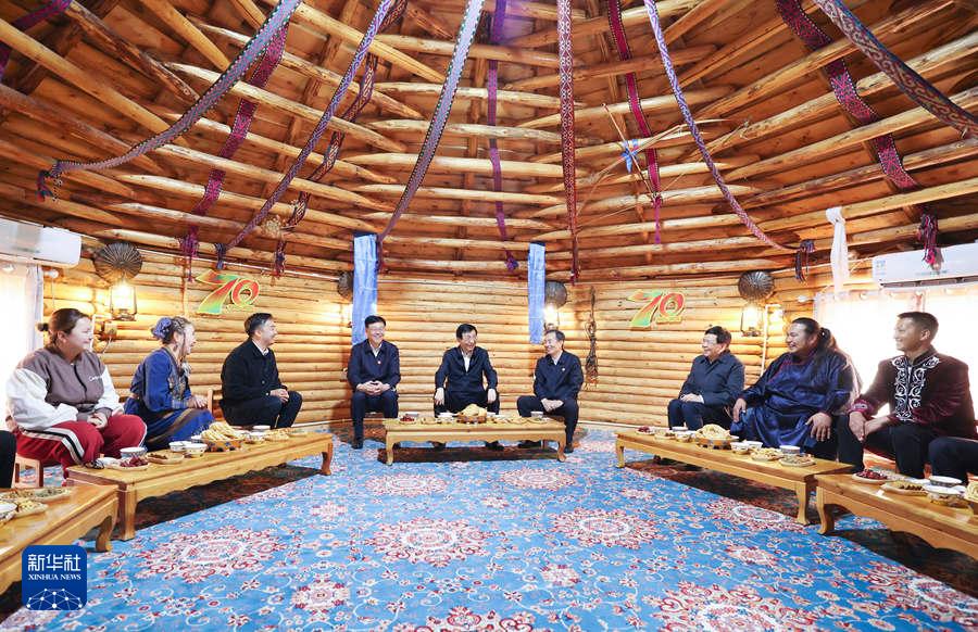 9月27日,受習近平總書記囑托,中共中央政治局常委、全國政協主席、中央代表團團長王滬寧帶領中央代表團部分成員到阿勒泰地區布爾津縣考察。這是王滬寧和中央代表團部分成員在扎拉特鄉村旅游專業合作社同村民交流。新華社記者 姚大偉 攝