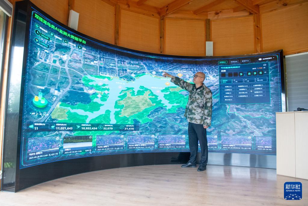 9月26日,重慶市梁平區濕地保護中心工作人員余先懷在雙桂湖國家濕地公園內介紹鳥類AI監測大數據平臺。