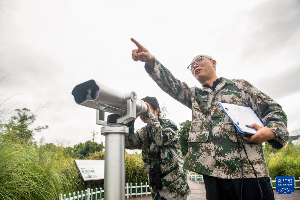 9月26日,重慶市梁平區濕地保護中心工作人員余先懷(右)、呂妮洪在雙桂湖國家濕地公園內使用望遠鏡觀測鳥群。