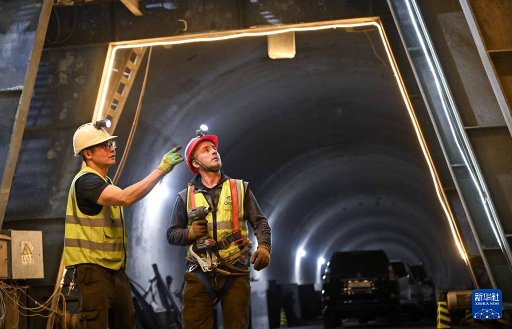 9月11日,一名中方員工(左)在塔吉克斯坦卡拉依洪姆村附近的中塔公路二期工程1號隧道施工現場指導塔方員工。 新華社記者 李任滋 攝