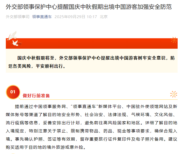 國慶中秋假期將至,外交部領事保護中心提醒出境中國游客樹牢安全意識,防范各類風險,平安順利出行。