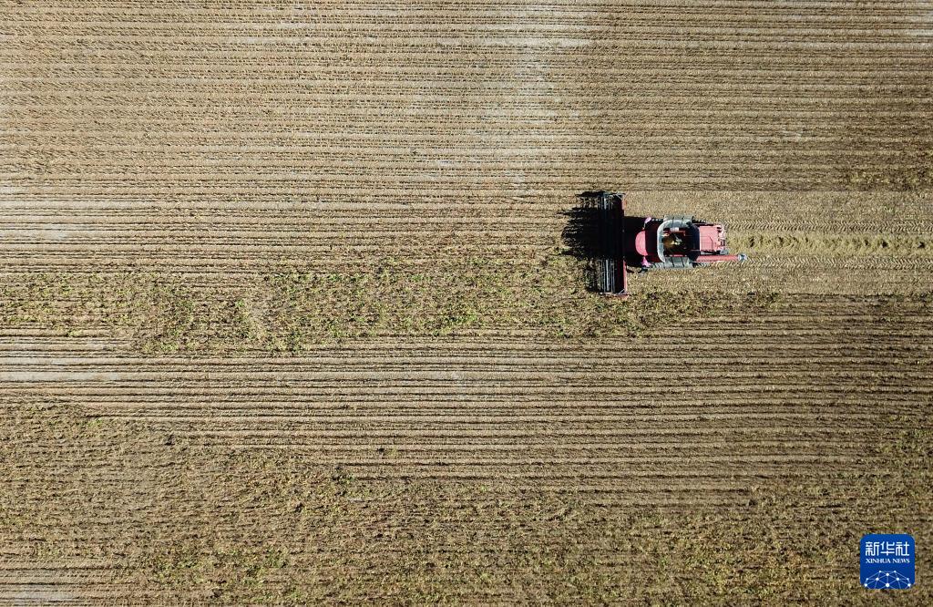 9月29日,在內(nèi)蒙古自治區(qū)興安盟扎賚特旗音德爾鎮(zhèn),大型機械在收獲大豆(無人機照片)。