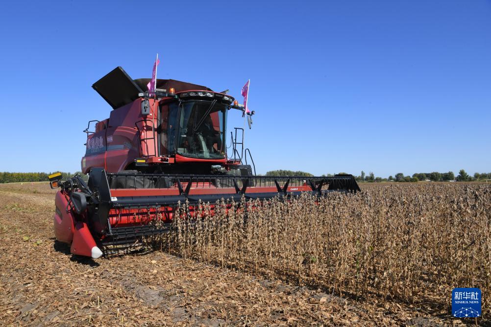 9月29日,在內(nèi)蒙古自治區(qū)興安盟扎賚特旗音德爾鎮(zhèn),大型機(jī)械在收獲大豆。