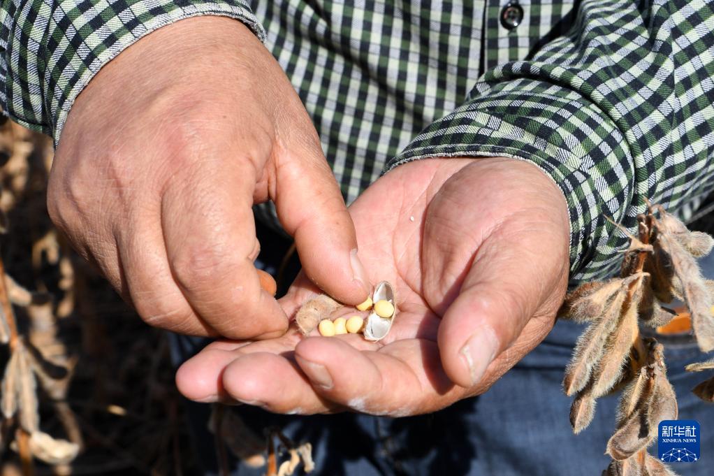 9月29日,在內蒙古自治區興安盟扎賚特旗音德爾鎮,扎賚特旗雨之潤農牧業專業合作社工作人員查看即將收獲的大豆品質。
